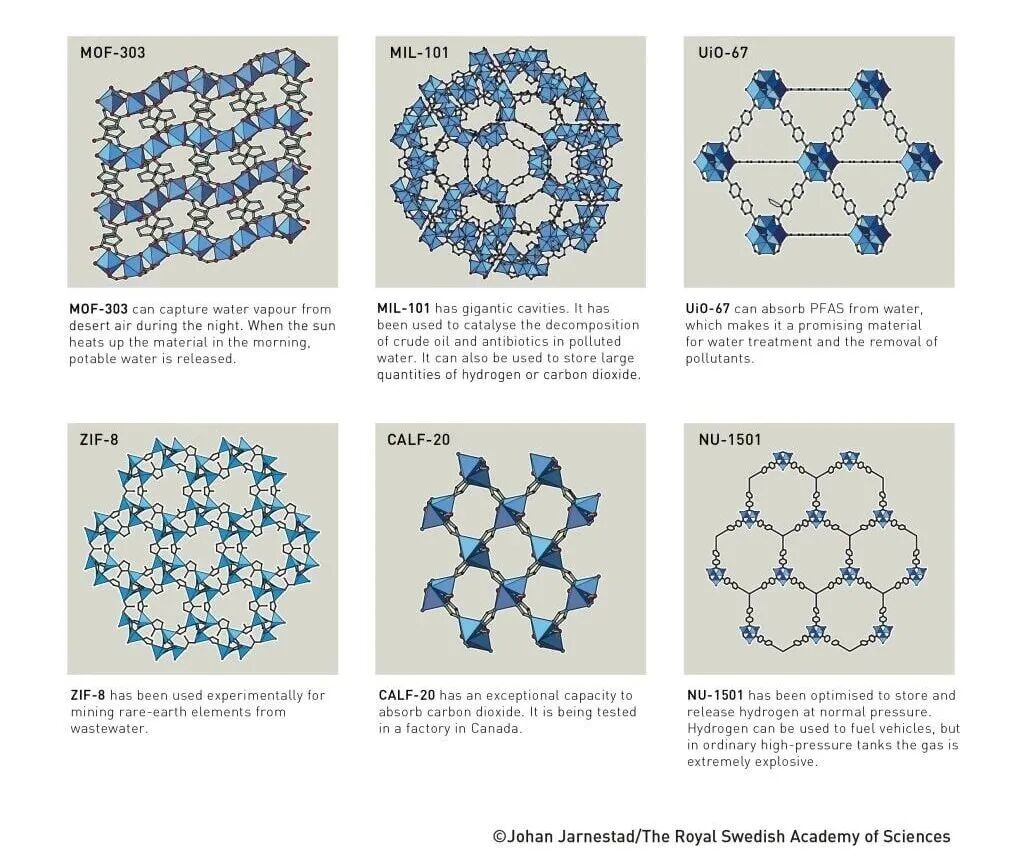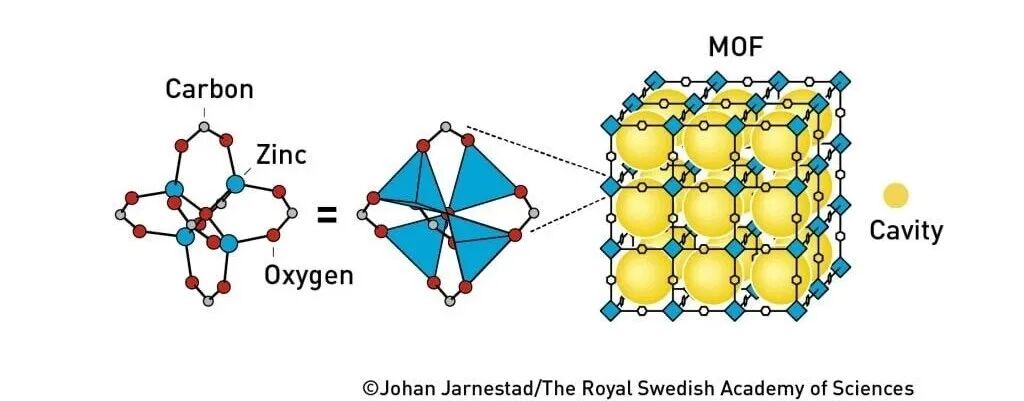 这种新型分子结构内部拥有大量空腔,分子可在其中自由进出。得益于三位科学家的工作,化学家如今已能设计出数以万计的不同MOF,为化学领域带来一连串“奇迹”。