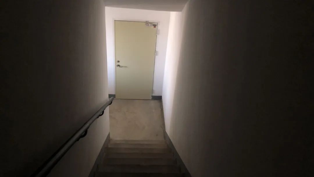 在邓女士的带领下,记者体验了这条少见的回家路。先从30楼出电梯后,又从安全出口下楼,一路开门关门,来到邓女士抽到回迁房门口,一共经过了6道防火门。此外,房门外的走廊上各种管道直接悬在空中,层高最低处只有2米左右。完全没有办法住人。