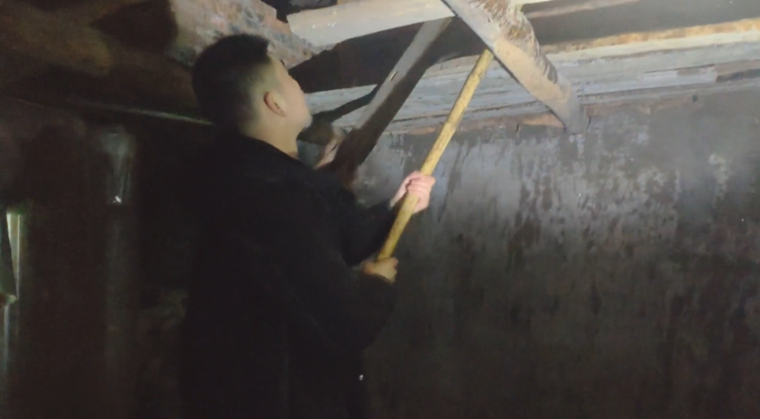 △程俊用木棍把房顶的瓦片捅下来