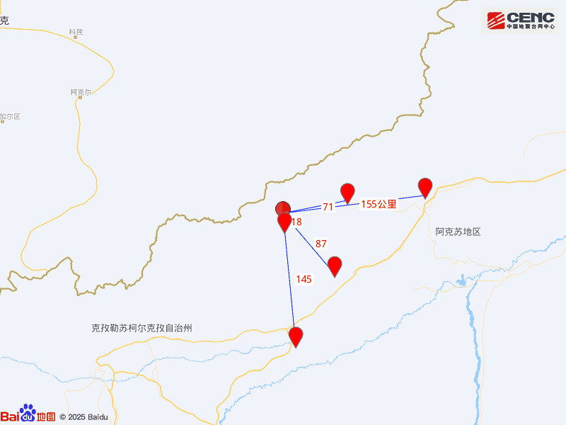 周边县城:震中距阿合奇县18公里、距乌什县71公里、距柯坪县87公里、距巴楚县145公里、距温宿县155公里,距图木舒克市149公里,距乌鲁木齐市816公里。