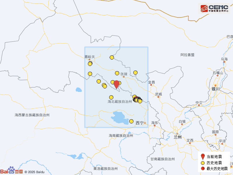 历史地震:根据中国地震台网速报目录,震中周边200公里内近5年来发生3级以上地震共60次,最大地震是2022年1月8日在青海海北州门源县发生的6.9级地震(距离本次震中132公里),按震级大小前50次历史地震分布如图。