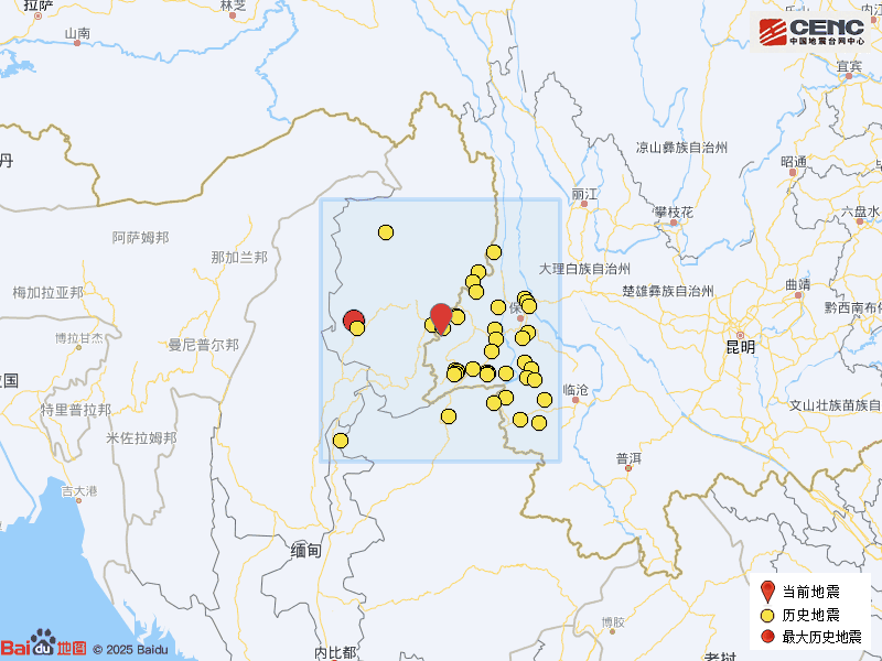 历史地震:根据中国地震台网速报目录,震中周边200公里内近5年来发生3级以上地震共52次,最大地震是2023年5月31日在缅甸发生的5.7级地震(距离本次震中146公里),按震级大小前50次历史地震分布如图。