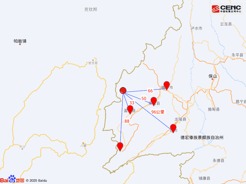 周边县城:震中距盈江县33公里、距梁河县50公里、距腾冲市66公里、距陇川县88公里、距芒市96公里,距德宏傣族景颇族自治州96公里,距昆明市491公里。