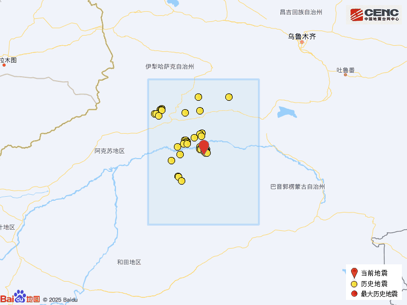历史地震:根据中国地震台网速报目录,震中周边200公里内近5年来发生3级以上地震共523次,最大地震是2023年1月30日在新疆阿克苏地区沙雅县发生的6.1级地震(距离本次震中179公里),按震级大小前50次历史地震分布如图。