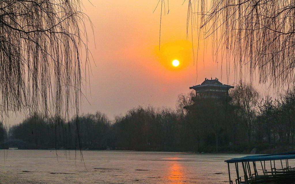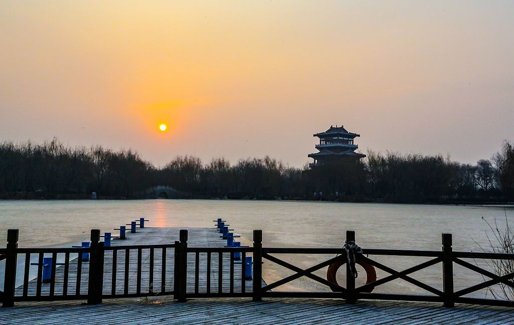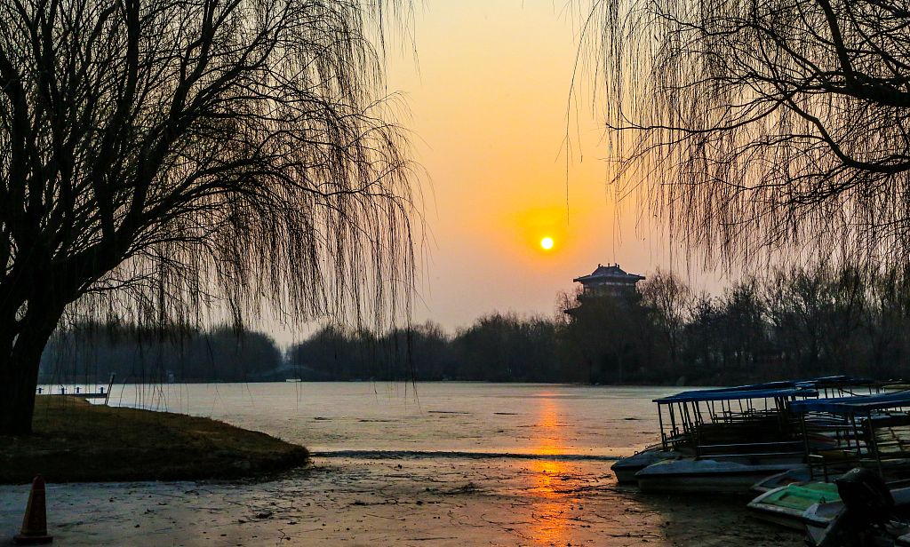 河北邯郸:实拍大寒时节龙湖日出 美若水墨画