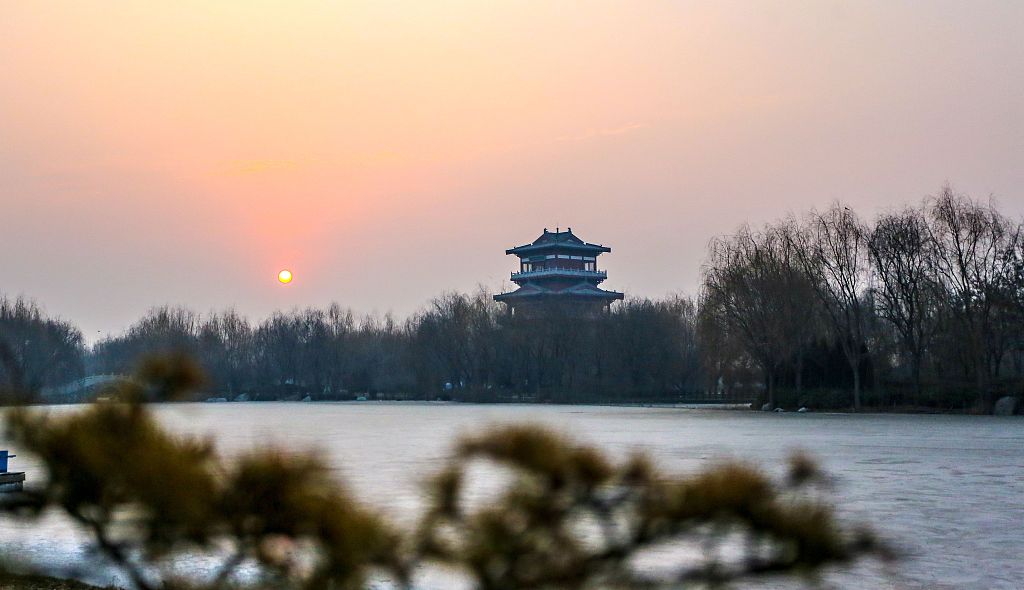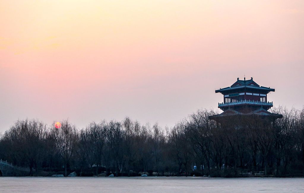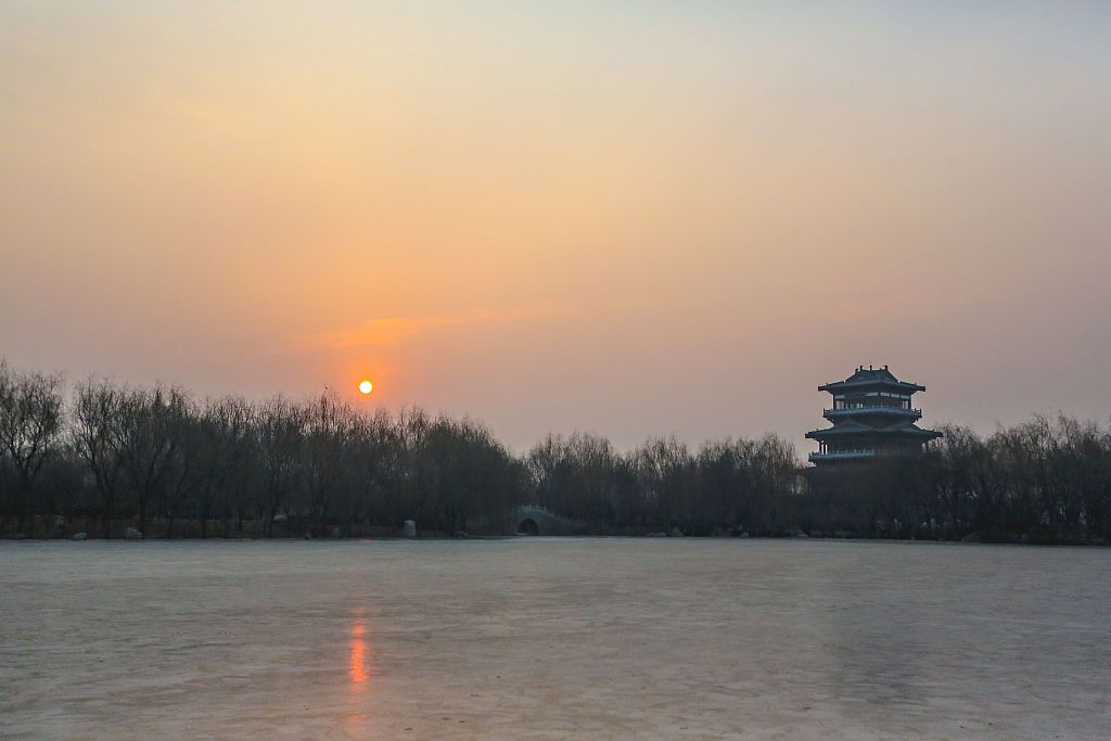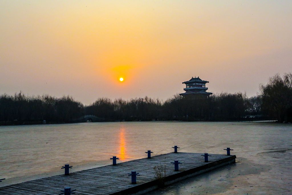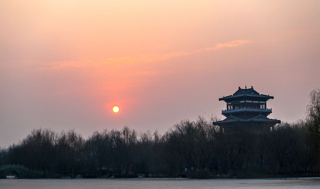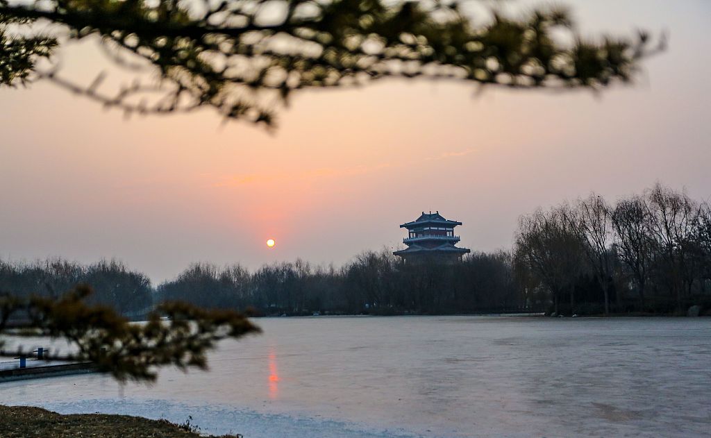 021年1月20日,河北省邯郸市,鸡泽县毛遂文化园的龙湖冻成一座冰湖。早晨七时半许,一轮淡淡的太阳从东方升起,朝霞黄里透暗红,逆光里的仿古建筑自荐阁和树木似淡墨濡染,一湖冰面微露暗光。整个情景酷似一幅高雅的水墨画。