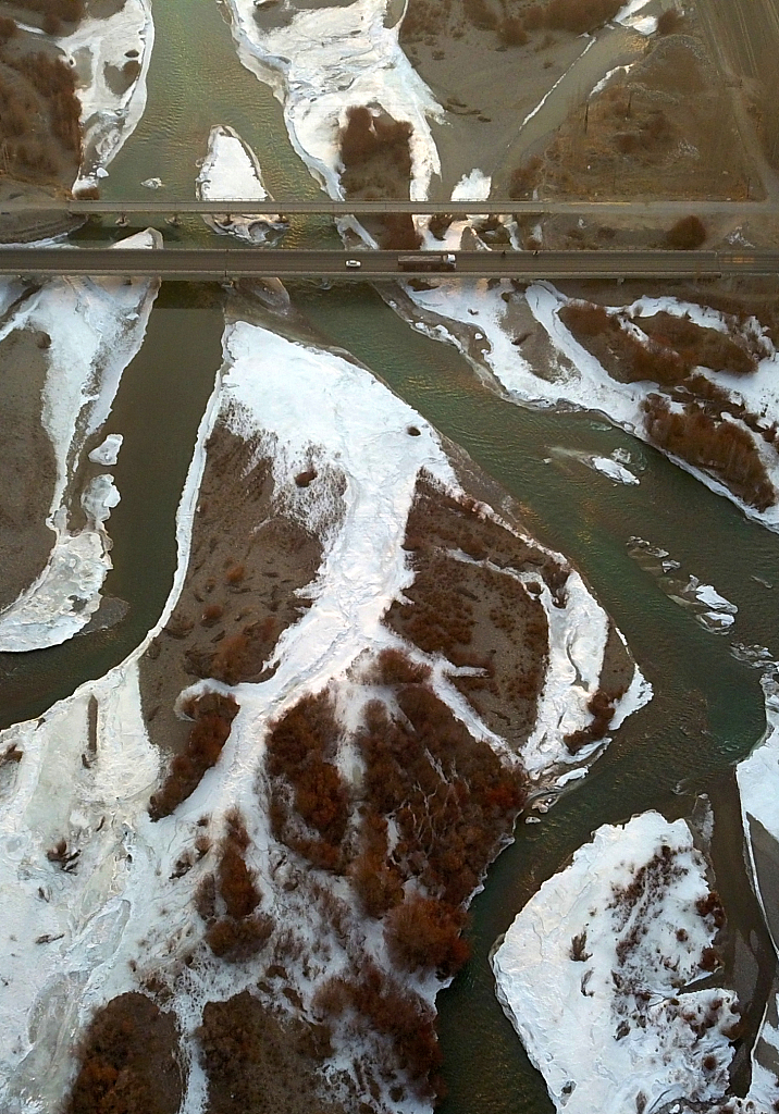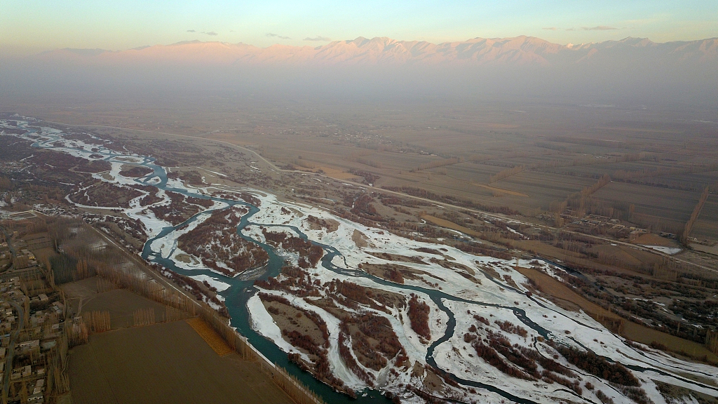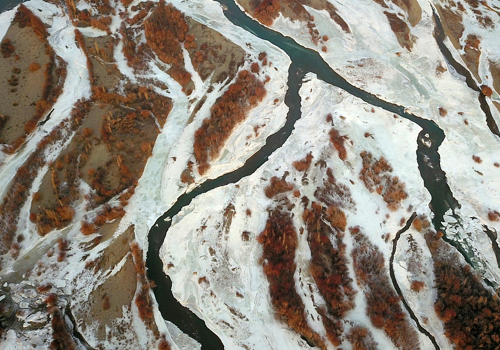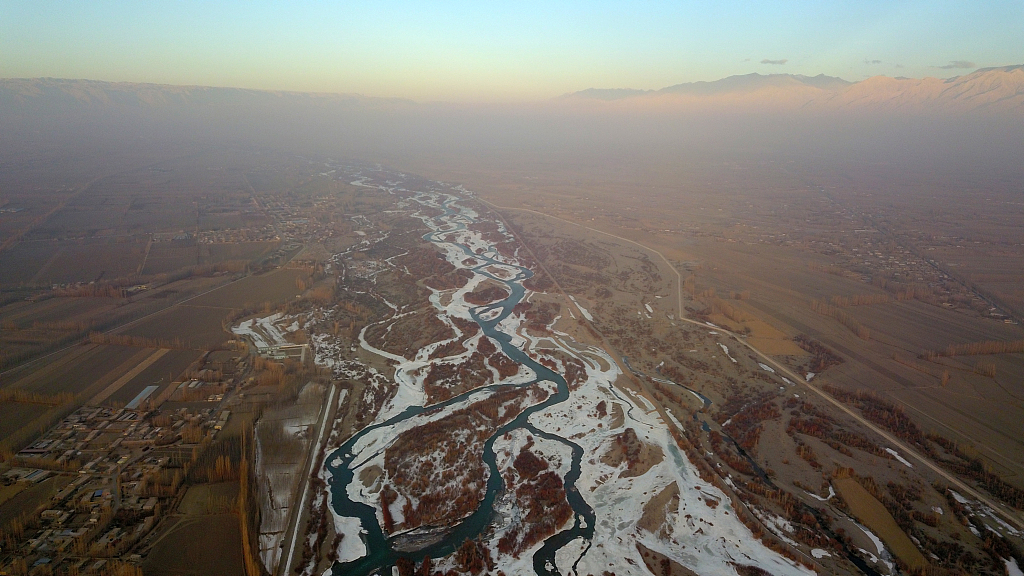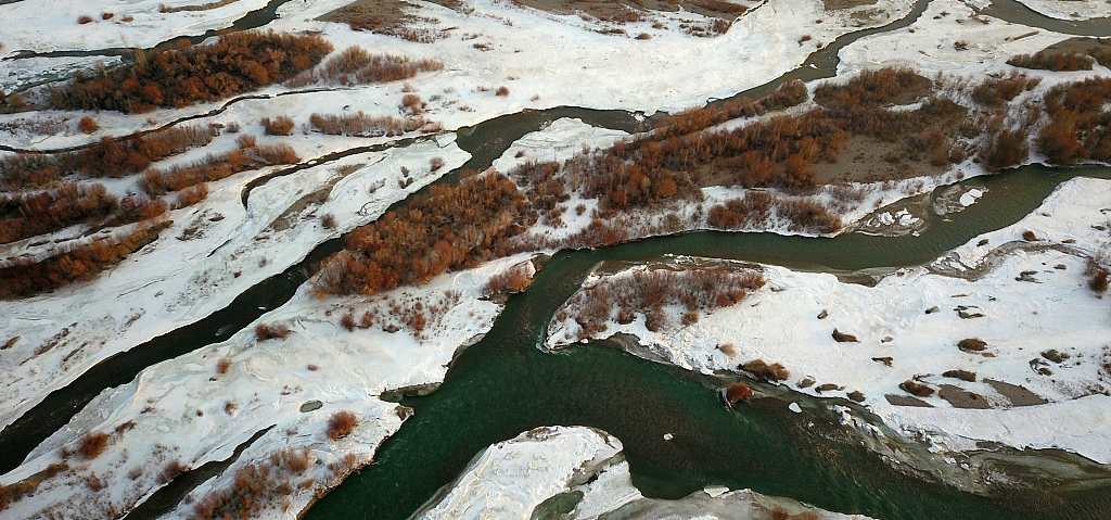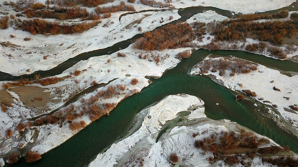2021年2月4日,新疆焉耆盆地的巴音郭楞蒙古自治州和静县段开都河冰化开河景象。初春季节,新疆开都河冰化开河,半冰半河构成一道美丽的画卷。开都河是新疆的大河之一,也是一条著名的内陆河,流域包括和静、和硕、焉耆、博湖等县。