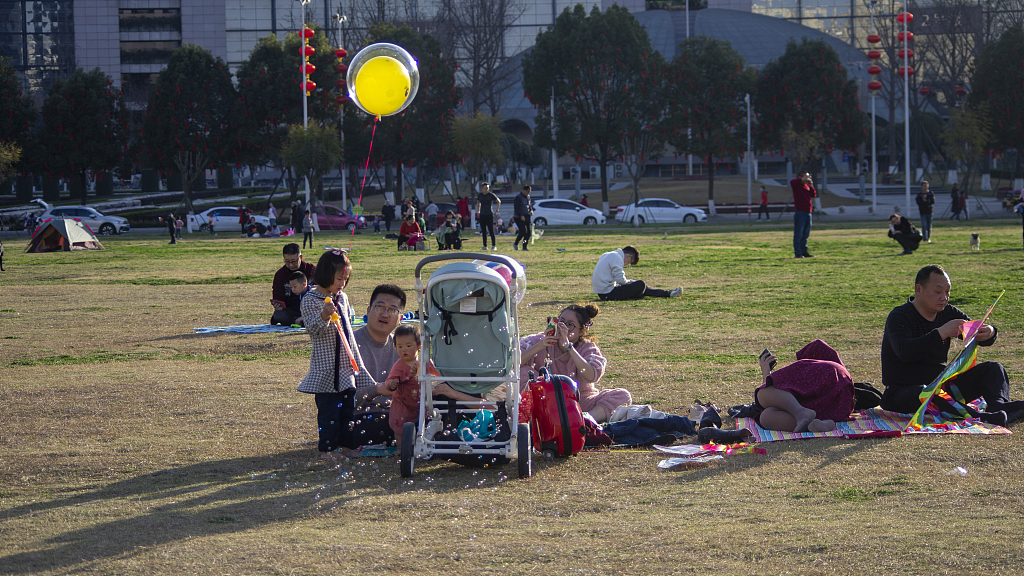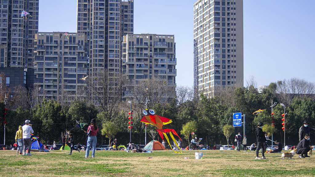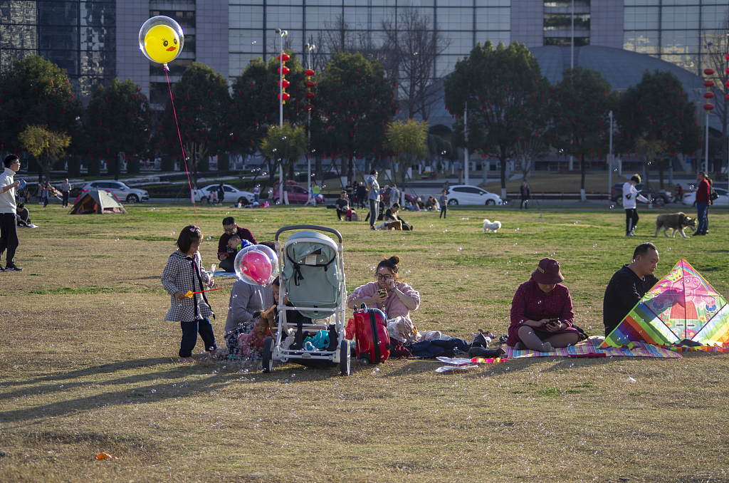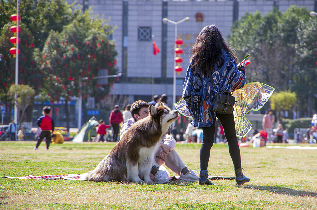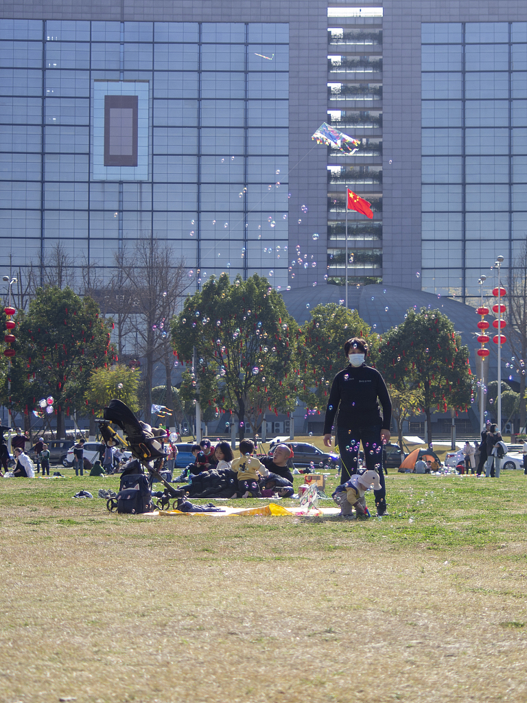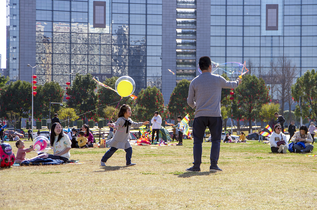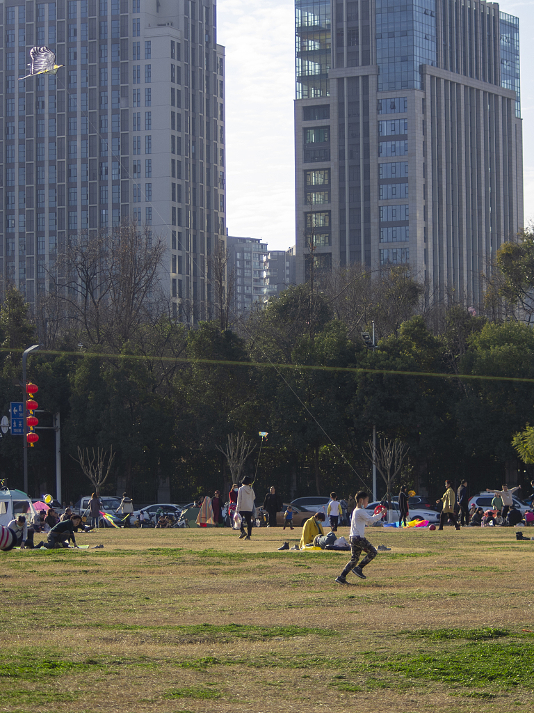 2021年2月16日,四川成都温江碧落湖光华公园,在节日期间,市民来到公园的草坪上嘻戏玩耍、放风筝,过一个愉快的节日。