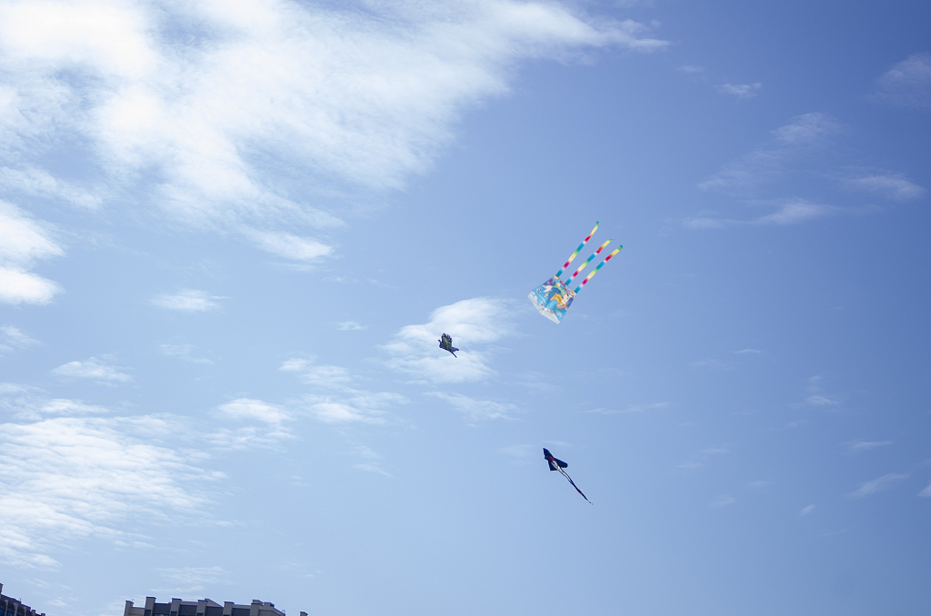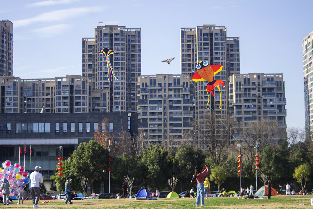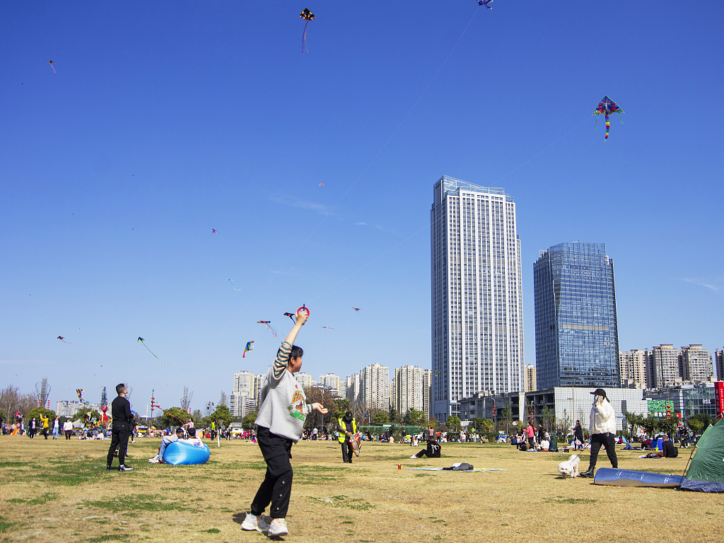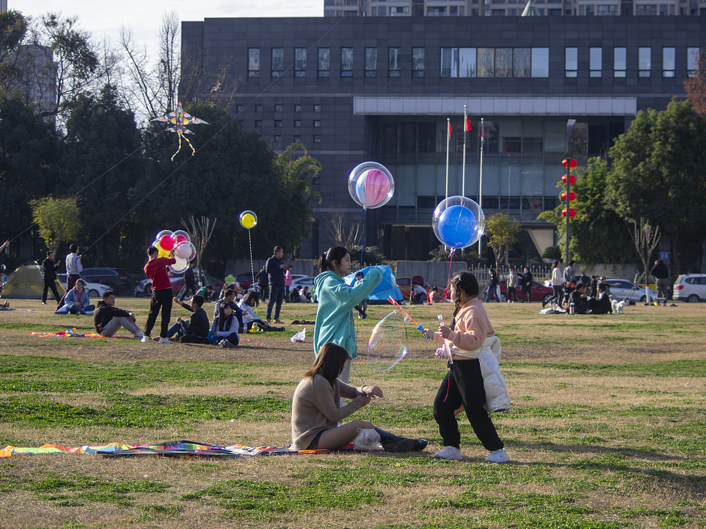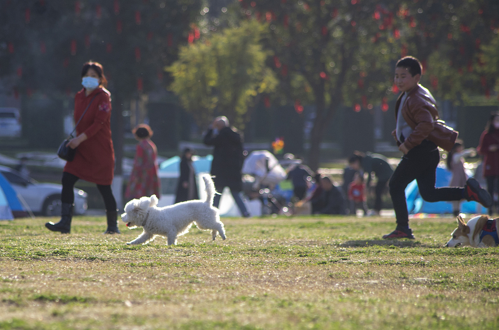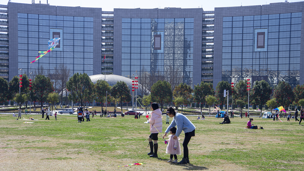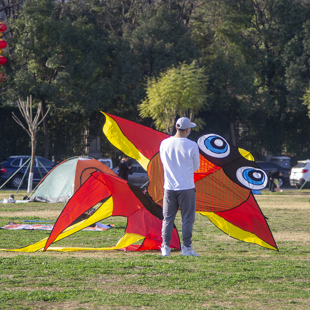 2021年2月16日,四川成都温江碧落湖光华公园,在节日期间,市民来到公园的草坪上嘻戏玩耍、放风筝,过一个愉快的节日。
