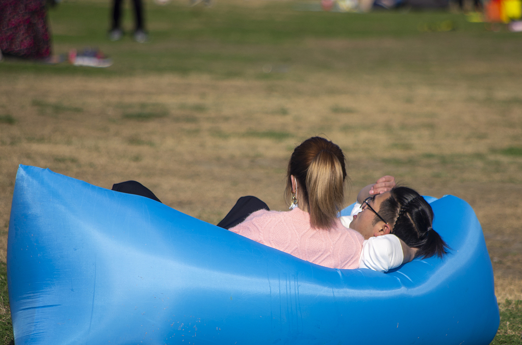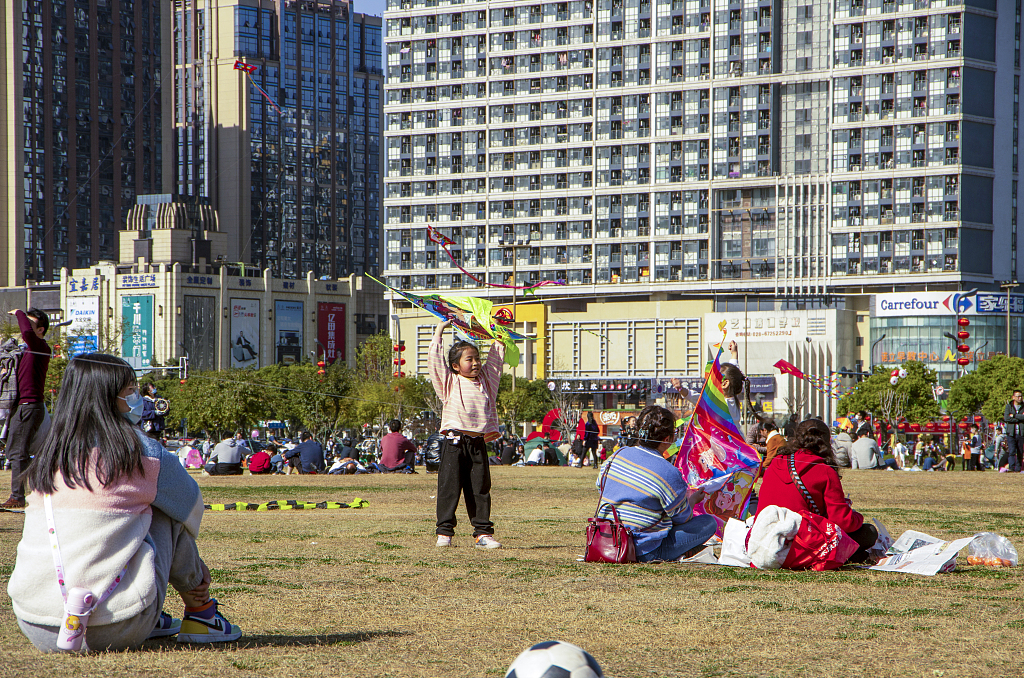 成都:市民公园草坪上嘻戏玩耍放风筝 度过轻松愉快假期