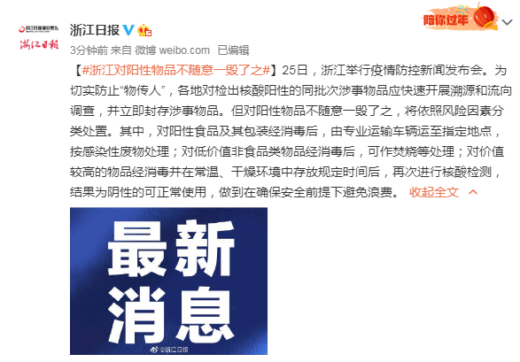 【#浙江对阳性物品不随意一毁了之#】25日,浙江举行疫情防控新闻发布会。为切实防止“物传人”,各地对检出核酸阳性的同批次涉事物品应快速开展溯源和流向调查,并立即封存涉事物品。但对阳性物品不随意一毁了之,将依照风险因素分类处置。其中,对阳性食品及其包装经消毒后,由专业运输车辆运至指定地点,按感染性废物处理;对低价值非食品类物品经消毒后,可作焚烧等处理;对价值较高的物品经消毒并在常温、干燥环境中存放规定时间后,再次进行核酸检测,结果为阴性的可正常使用,做到在确保安全前提下避免浪费。