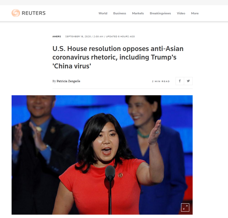 路透社:美国众议院通过决议反对有关新冠病毒的反亚裔言论,包括特朗普的“中国病毒”言论