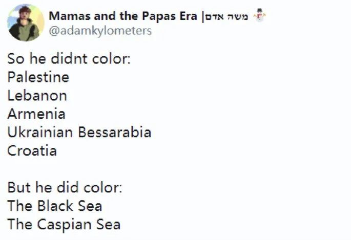 也有人发现:“他没有给(这些地方)涂色:巴勒斯坦、黎巴嫩、亚美尼亚……而他涂了色的(地方有):黑海、里海。” ↓