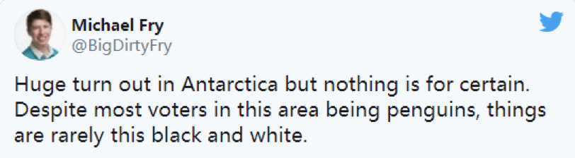 另有人讽刺:“南极洲有着巨大的变化,但没有什么是确定的。尽管这个地区的‘选民’大多数是企鹅,但事情很少有这么黑白分明。”↓