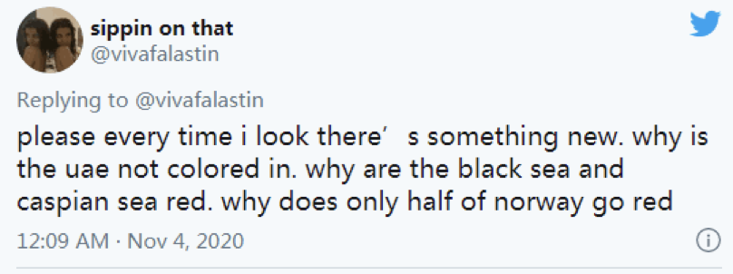 还有眼尖的网友发现更多其他“错误”,一位网友称,“拜托,每次我看(这张图)都能发现新东西。为什么阿联酋没有上色?为什么黑海和里海都是红色的?为什么只有一半的挪威变红了?” ↓
