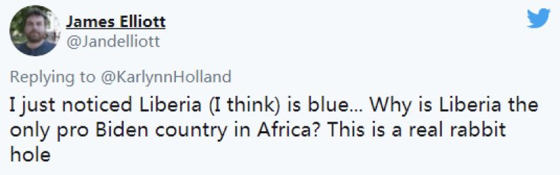 RT提到,利比里亚“投票”给拜登也引发一些网友不满。在不少网友看来,利比里亚与美国民主党之间没有任何明显联系。一位网友写道:“我刚注意到利比里亚(我认为是这里)的地方是蓝色的。为什么利比里亚是非洲唯一支持拜登的国家?”↓