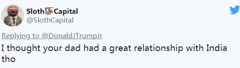 RT称,一些人对于小特朗普将“印度”归于支持拜登的阵营感到困惑。一位网友写道:“我认为你的父亲和印度关系很不错呀。”↓