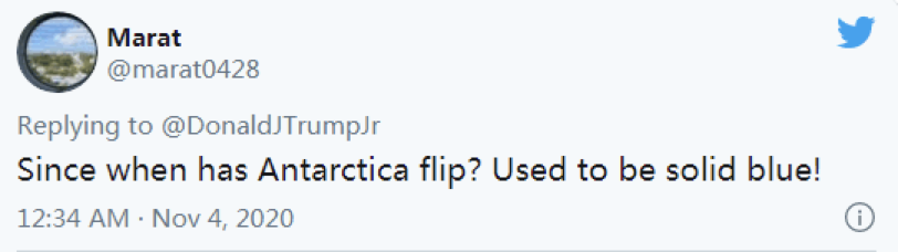 RT称,(图中)特朗普在南极洲的所谓“胜利”让许多推特用户震惊,有人开玩笑说,南极洲以前是“纯蓝色”,但现在显然变成了支持共和党。