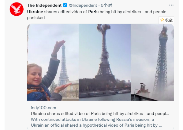 英国《独立报》也发布了同一段视频,并配文说:“乌克兰分享了巴黎遭受空袭的视频,人们惊慌失措”。↓