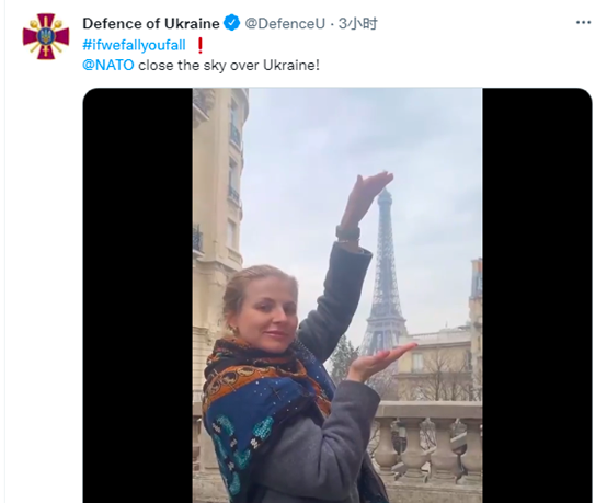 这则推特同样附上了“如果我们倒下,你也会倒下”的标签,乌克兰国防部还@北约的官方账号,并配文称“在乌克兰设立禁飞区!”