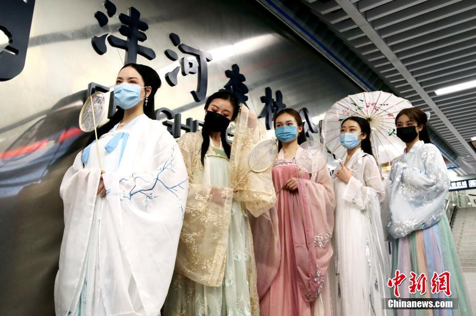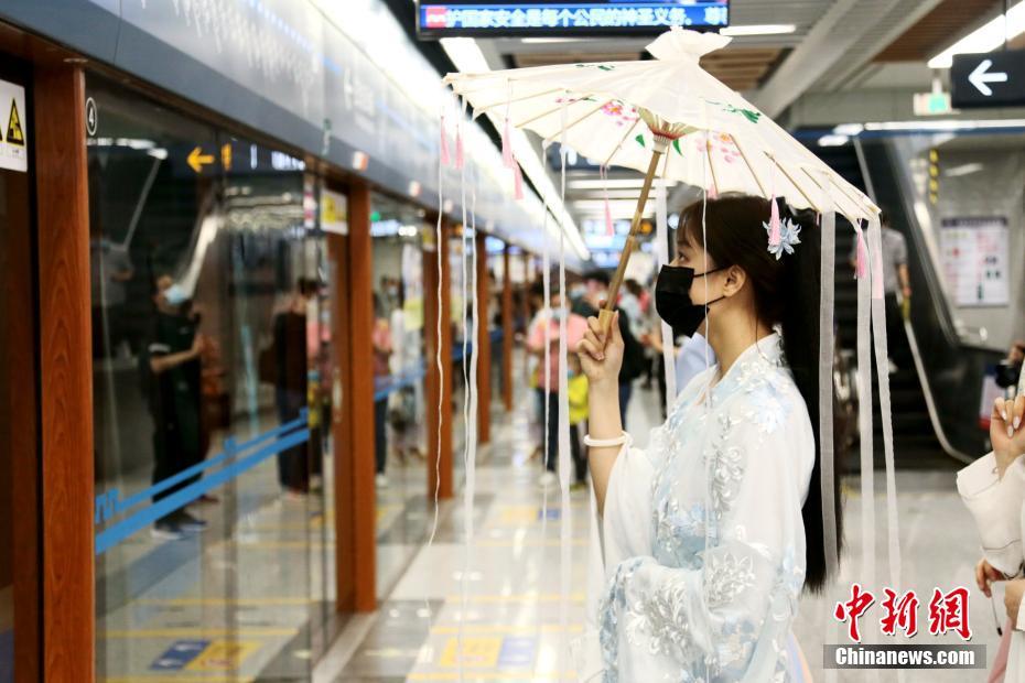 4月30日,工作人员身着汉服准备搭乘地铁。当日,以“悦见大美西咸,诗意春风之旅”为主题的地铁文化专列从西安地铁1号线沣河森林公园站发车,工作人员一路向乘客宣传西咸新区的旅游热门景点、路线和网红“打卡”地。 中新社记者 张远 摄