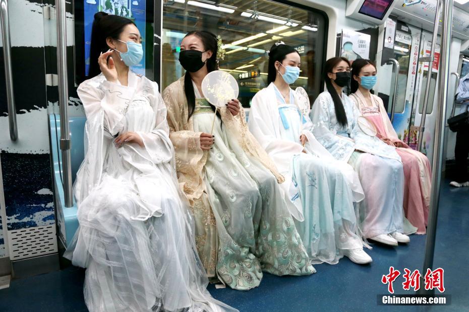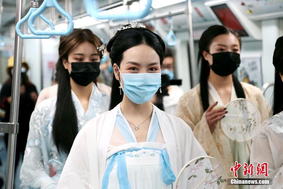 4月30日,工作人员身着汉服搭乘地铁。当日,以“悦见大美西咸,诗意春风之旅”为主题的地铁文化专列从西安地铁1号线沣河森林公园站发车,工作人员一路向乘客宣传西咸新区的旅游热门景点、路线和网红“打卡”地。 中新社记者 张远 摄
