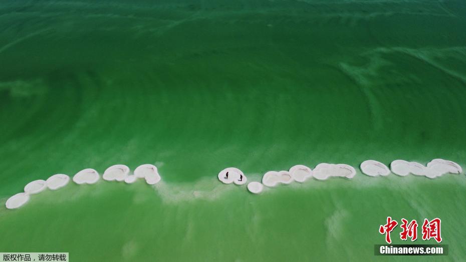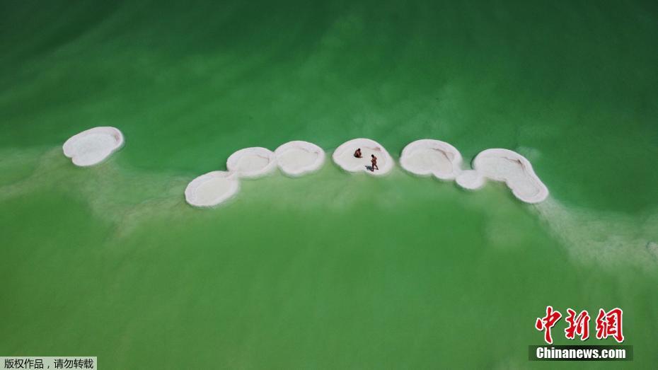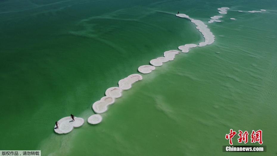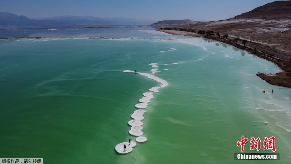 死海岸边现盘状盐层 俯瞰如珍珠项链