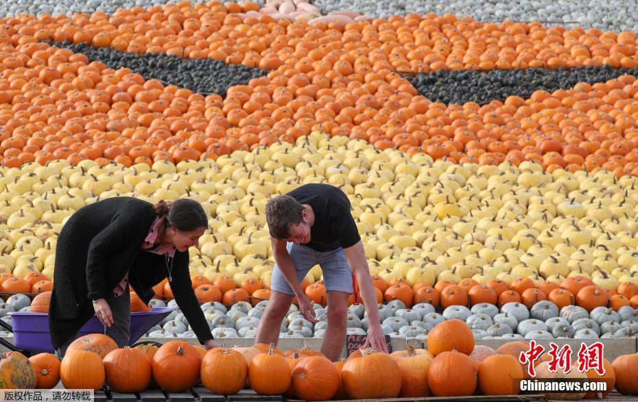 当地时间10月20日,英国汉普郡托顿,万圣节将至,人们在桑尼菲尔德农场挑选南瓜。该农场每年种植6万多颗南瓜,今年展出了一个巨大的戴着口罩的南瓜作品,用6000多个南瓜拼凑而成。