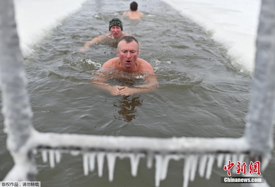 当地时间12月6日,俄罗斯鄂木斯克开启冬泳季,一群冬泳爱好者在已经结冰的湖中凿开冰洞冬泳健身。