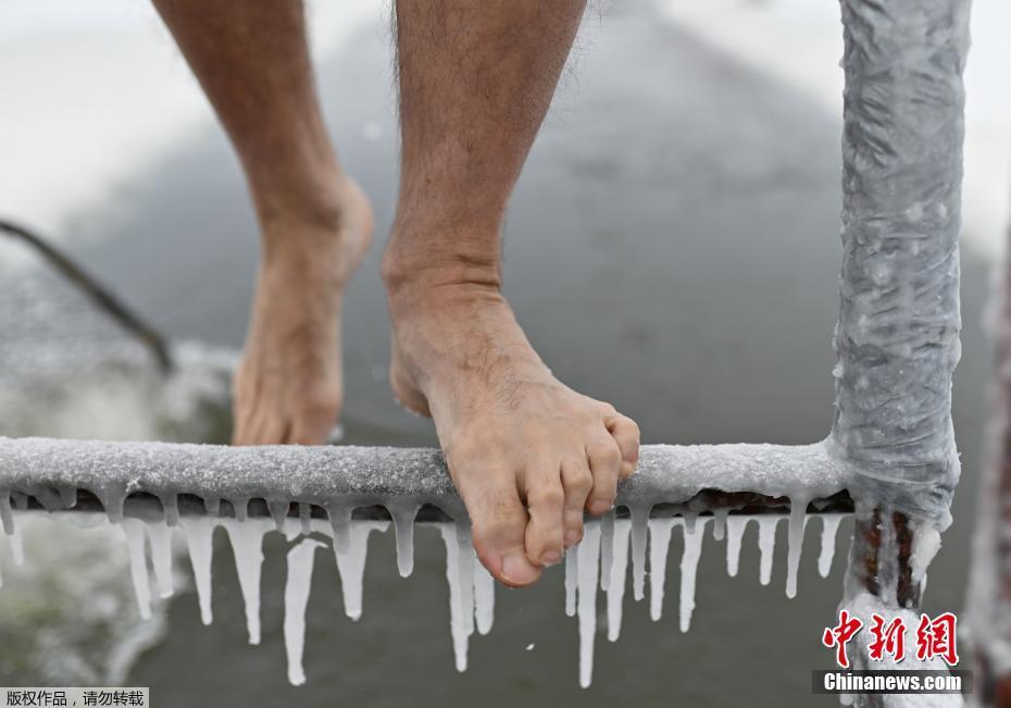 当地时间12月6日,俄罗斯鄂木斯克开启冬泳季,一群冬泳爱好者在已经结冰的湖中凿开冰洞冬泳健身。图为一名男子踩在已经结冰的梯子上。