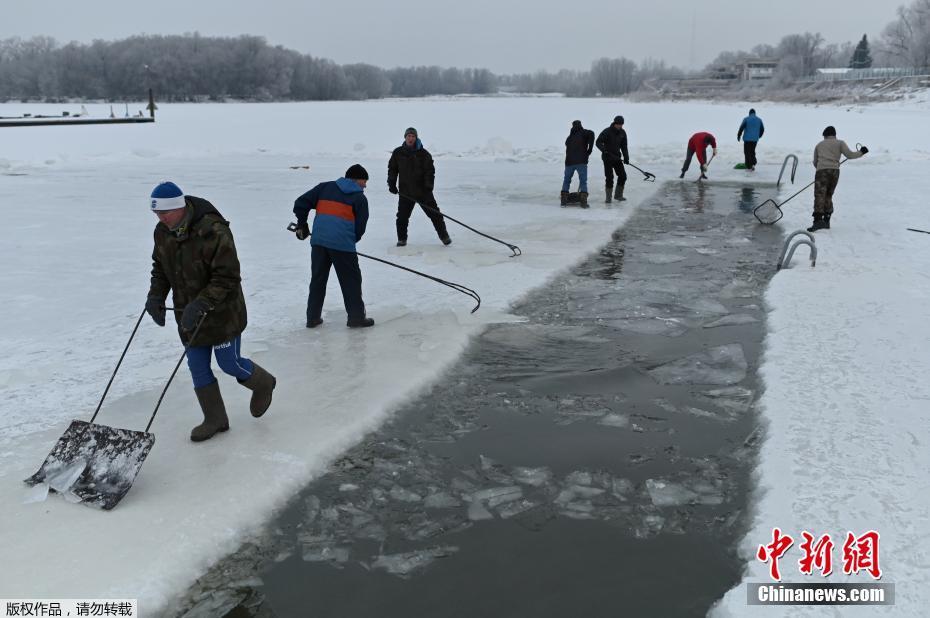 当地时间12月6日,俄罗斯鄂木斯克开启冬泳季,一群冬泳爱好者在已经结冰的湖中凿开冰洞冬泳健身。图为民众在整理凿开的冰洞。