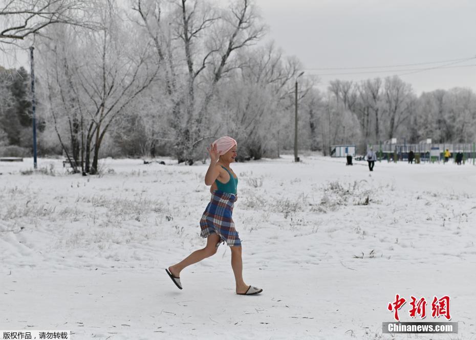 当地时间12月6日,俄罗斯鄂木斯克开启冬泳季,一群冬泳爱好者在已经结冰的湖中凿开冰洞冬泳健身。图为一名女子跑过盖满白雪的原野。