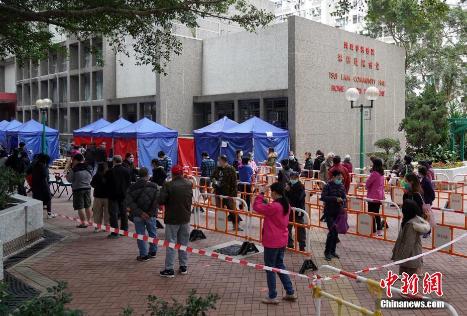 1月4日下午,众多市民在香港将军澳翠林邨的流动采样站参加新冠病毒检测。翠林邨辉林楼近日发现多宗确诊病例,涉及两个不同单位,特区政府将辉林楼列入强制检测公告,政府4日下午开始安排检测承办商为辉林楼住户和访客进行检测服务。图为发生疫情的翠林邨辉林楼。 中新社记者 张炜 摄