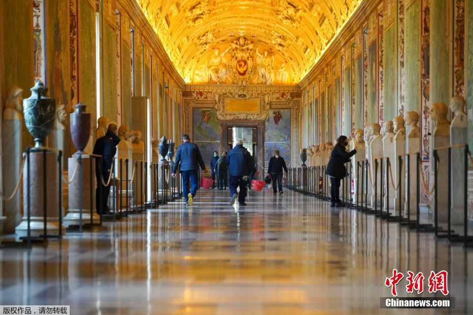 当地时间2月1日,梵蒂冈博物馆在关闭88天后,重新对比游客开放。图为博物馆工作人员在博物馆过道上准备重新开馆。