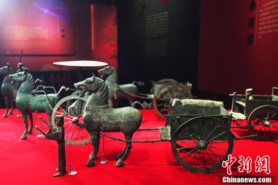 3月31日,历时近两年策划筹备的《大三国志展》在成都武侯祠博物馆开展。图为展出的汉代铜车马仪仗俑队。 中新社记者 安源 摄