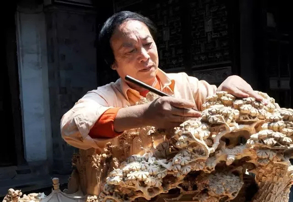 黄紫金在有生之年始终不忘培养木雕新秀,将自己的技术毫无保留地传授给年轻人。