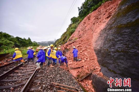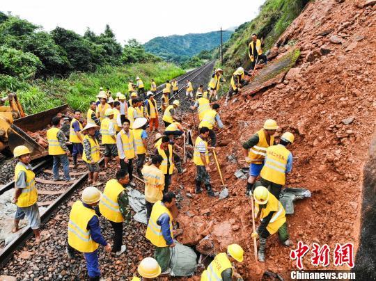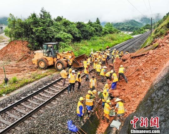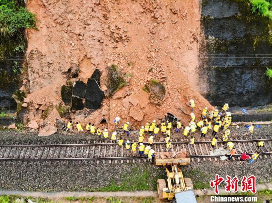6月20日,受连续暴雨影响,皖赣铁路江西景德镇段一处高边坡出现山体滑坡,危及铁路运行安全。