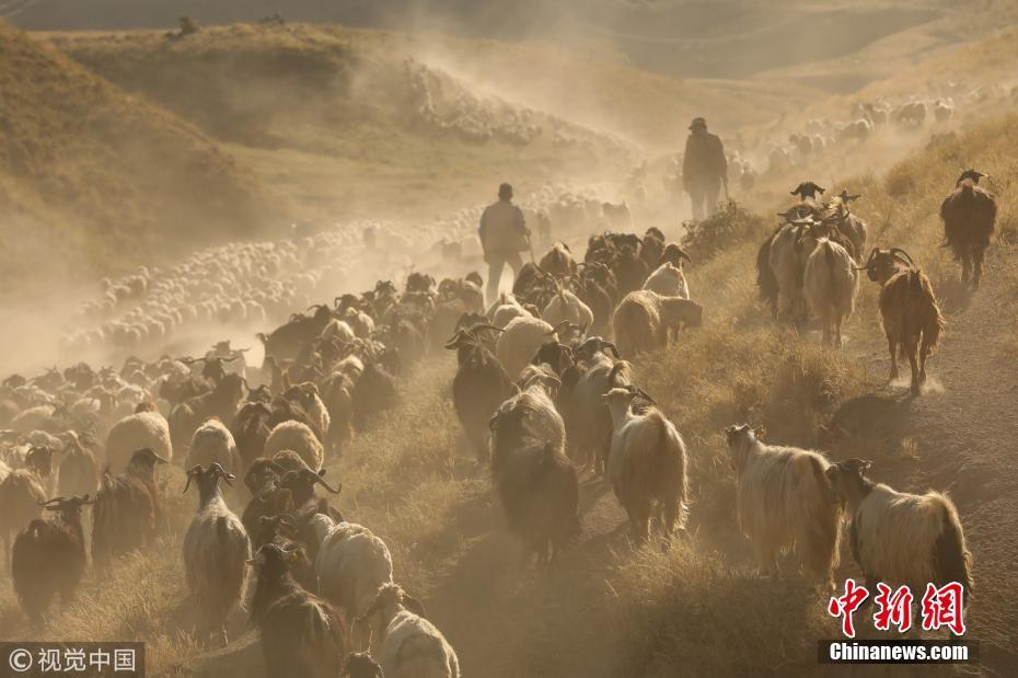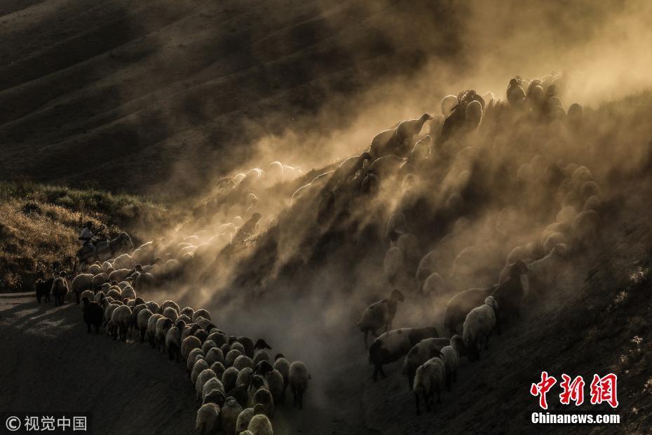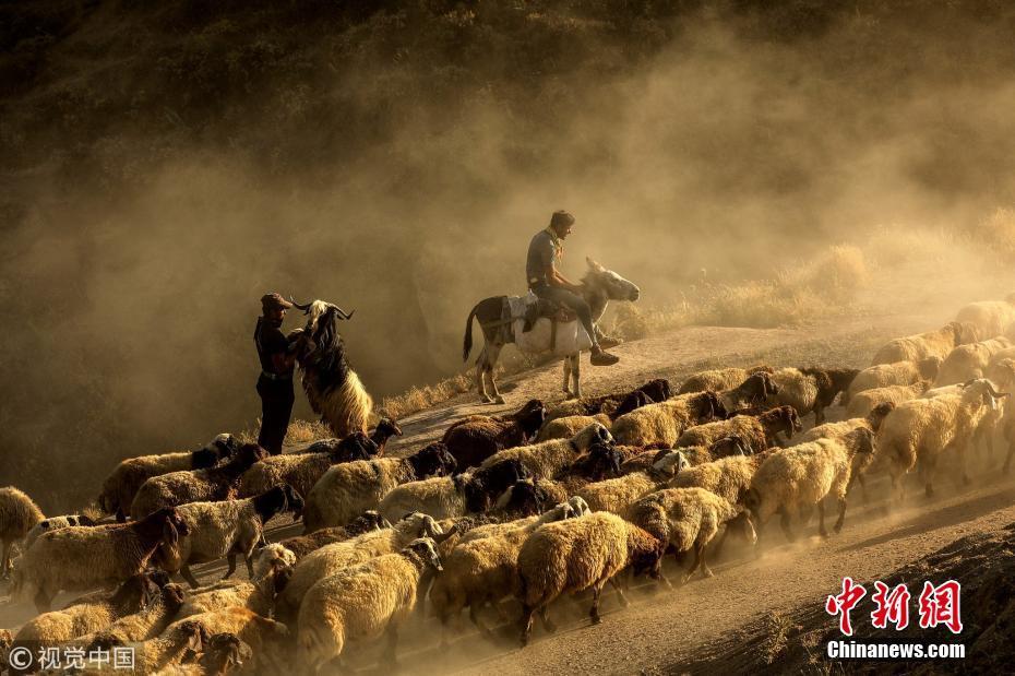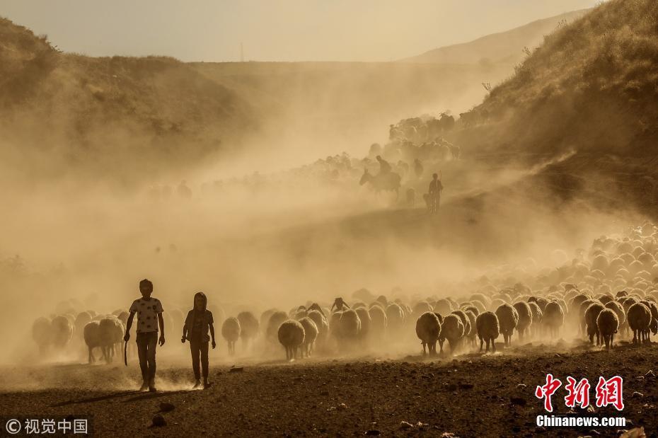 当地时间2018年7月26日,土耳其比特利斯,日落时分,牧羊人驱赶羊群经过内姆鲁特山高地卷起尘土景象壮观。图片来源:视觉中国