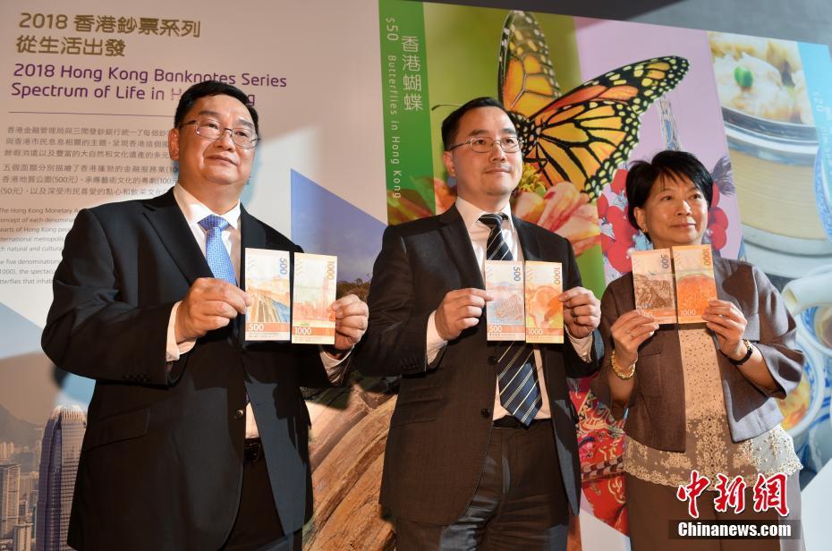 12月11日,香港金融管理局及三家发钞银行公布,2018新系列1000港元钞票将于12月12日正式上市流通,500港元新钞将于明年1月23日起流通。市民可从发行当日起在三家发钞银行兑换新钞。图为香港印钞公司总经理阮志才(左)、香港金管局助理总裁鲍克运(中)和香港金管局主管(货币与结算)陈叶小明(右)展示即将流通的新钞票。中新社记者 张炜 摄