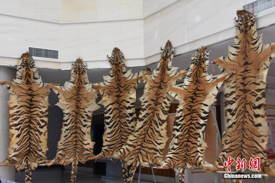 此系列案件从2017年6月起开始侦查,一直延续至2018年12月,案件所查获的老虎皮数量为近年中国森林公安部门破获的相似案件中最多的一起。图为警方查获的大象皮。钟建珊 摄