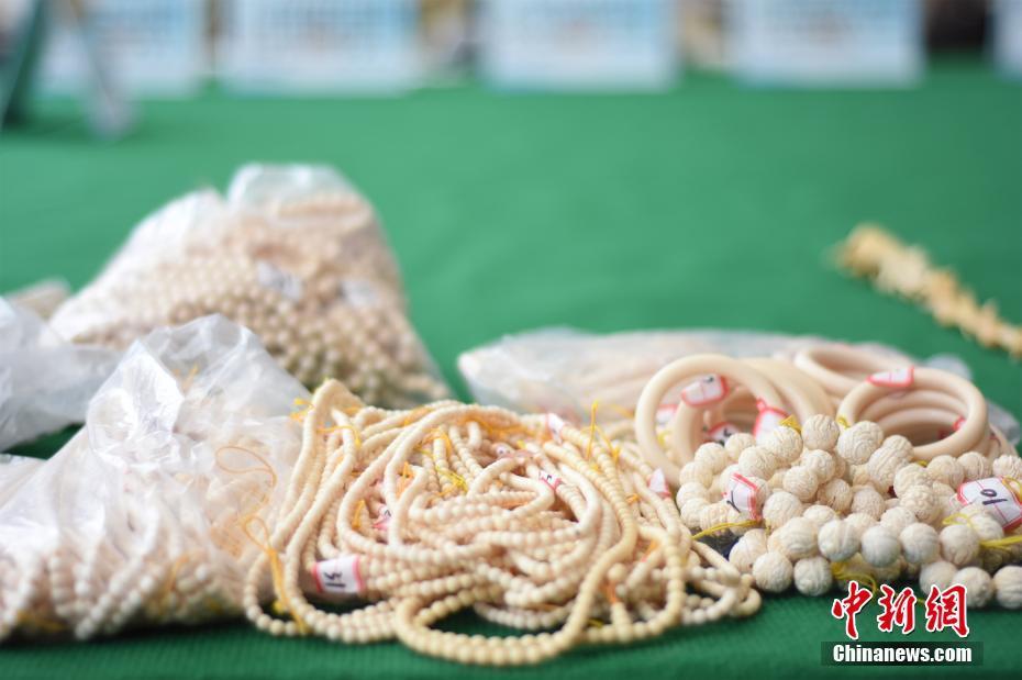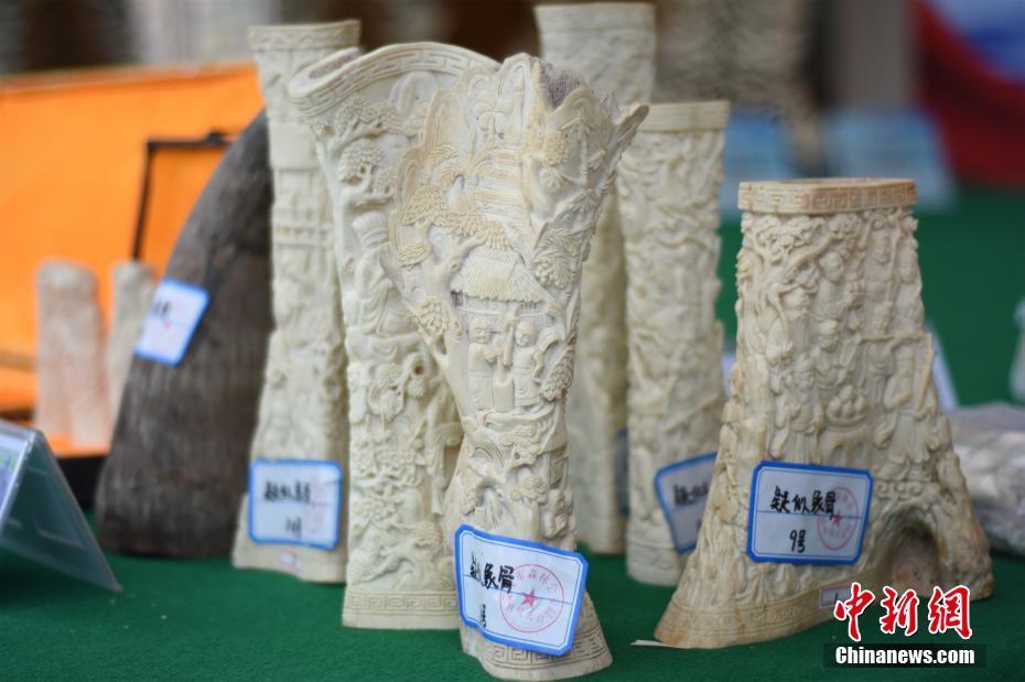 12月25日,广西壮族自治区森林公安局公布一批查获的非法野生动物制品、干品等。据介绍,该局今年7月份以来相继破获4起特大跨国非法收购、运输、出售珍贵、濒危野生动物制品系列案,抓获犯罪嫌疑人24人(其中越南籍1人),查获老虎皮11张、蟒蛇胆1595个、穿山甲鳞片81.49公斤等,案件涉案物品价值共计2971.5万人民币。图为涉案象牙制品。钟建珊 摄