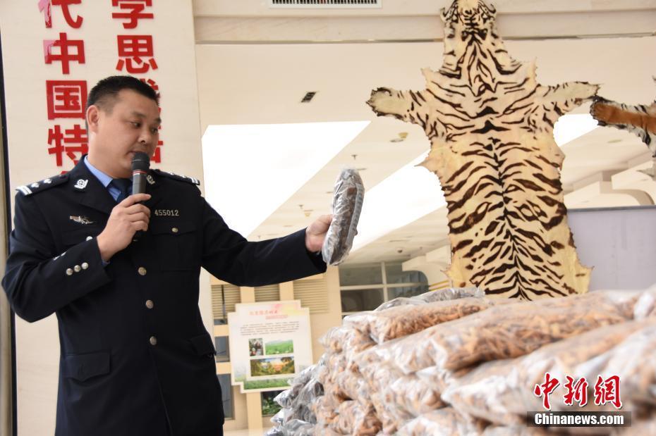 据介绍,该局今年7月份以来相继破获4起特大跨国非法收购、运输、出售珍贵、濒危野生动物制品系列案,抓获犯罪嫌疑人24人(其中越南籍1人),查获老虎皮11张、蟒蛇胆1595个、穿山甲鳞片81.49公斤等,案件涉案物品价值共计2971.5万人民币。图为一名森林公安工作人员展示警方查获的涉案野生动物物品。 钟建珊 摄