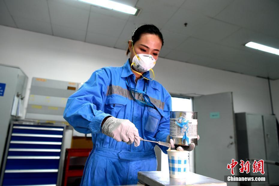 杨明芝在维修车间调试飞机复合材料修理的粘合胶。王东明 摄