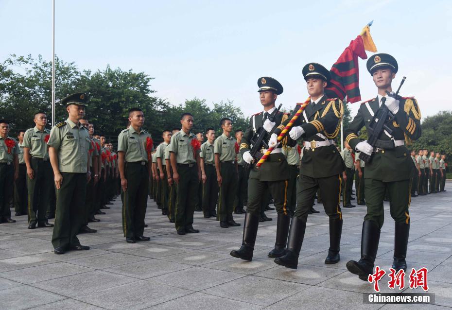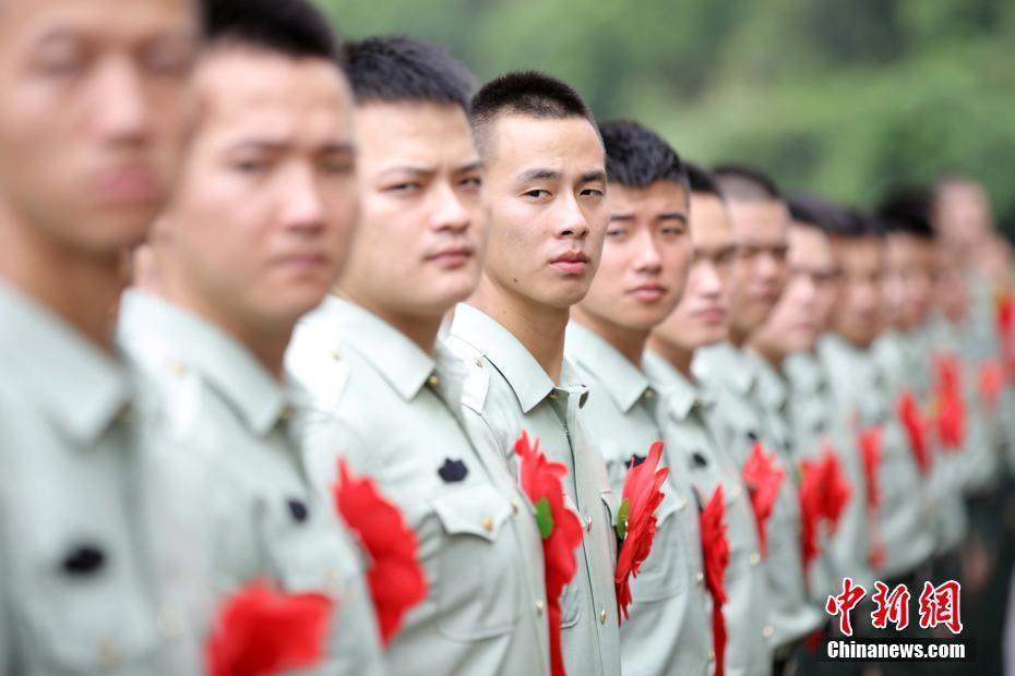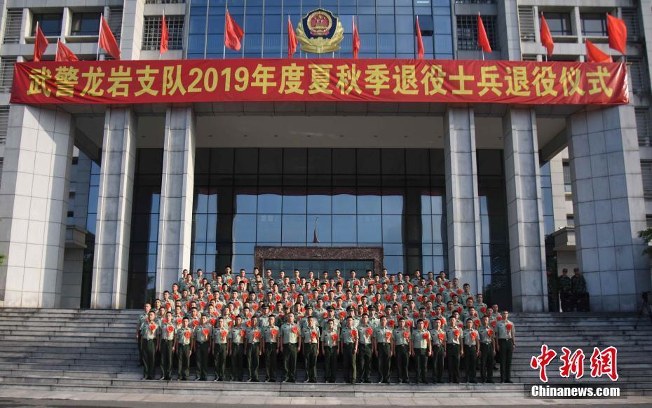 图为武警福建总队龙岩支队举行士兵退役仪式送别退役老兵,131名退役老兵卸下军衔、帽徽、领花,戴上退伍红花离开部队返回家乡。 高铭 摄