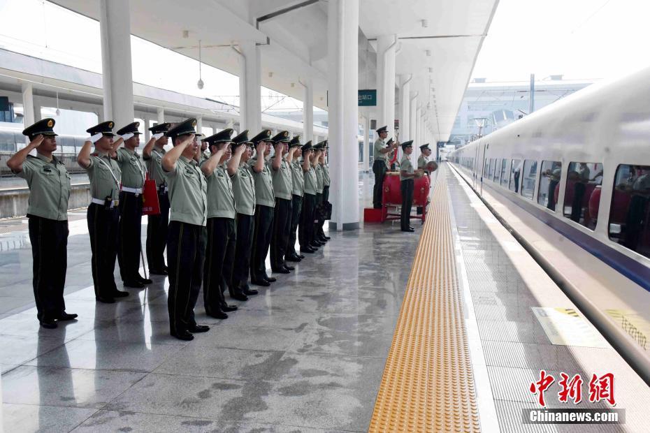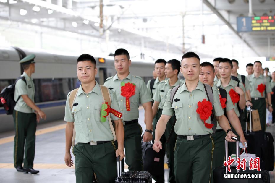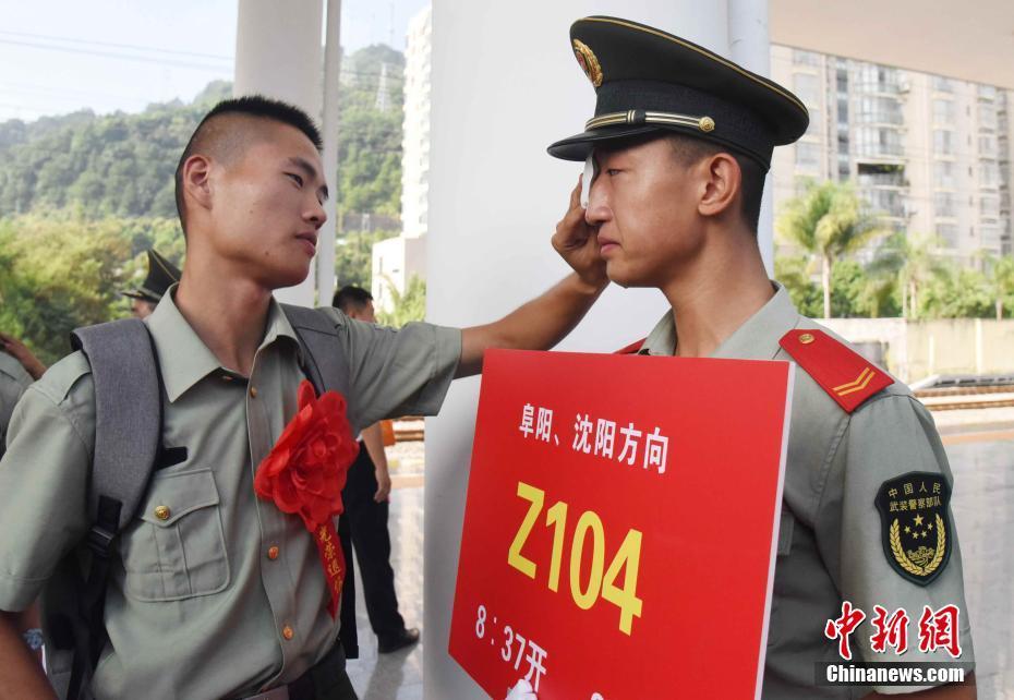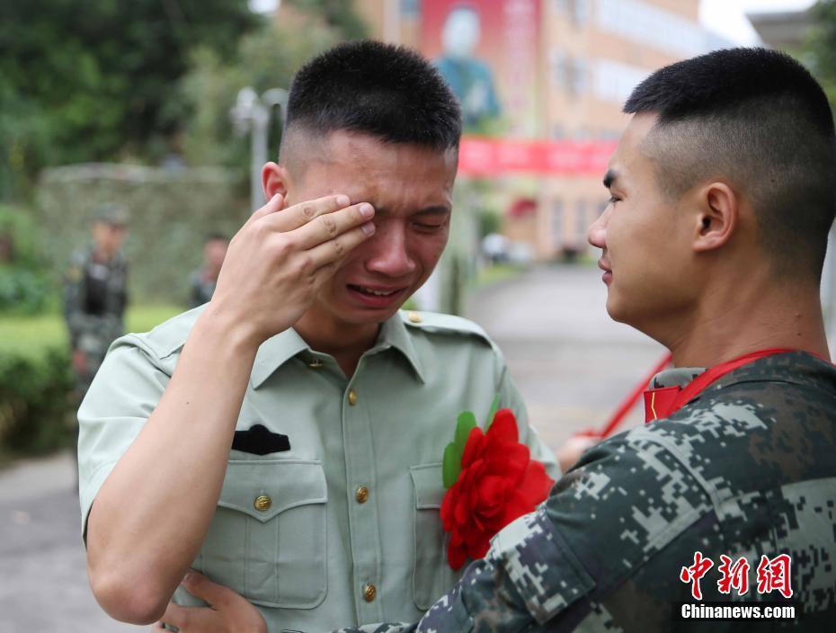 青春无悔军旅路,光荣岁月留芳华。9月1日,武警福建总队龙岩支队举行士兵退役仪式送别退役老兵。131名退役老兵卸下军衔、帽徽、领花,戴上退伍红花离开部队返回家乡,他们怀着对军旅的留恋和绿军装的热爱,难掩不舍之情流下热泪,与朝夕相处的战友依依惜别。图为老兵与朝夕相处的战友在车站依依惜别。 郭大伟