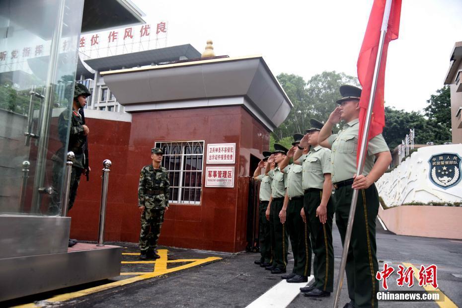 图为退役老兵向武警部队旗告别。 郭大伟 摄