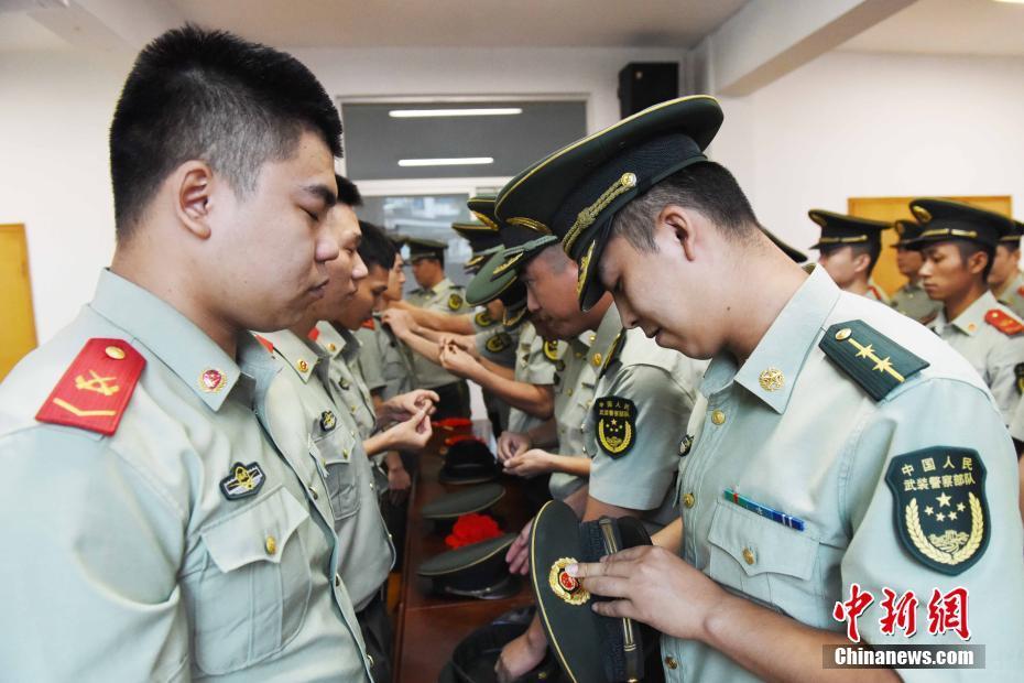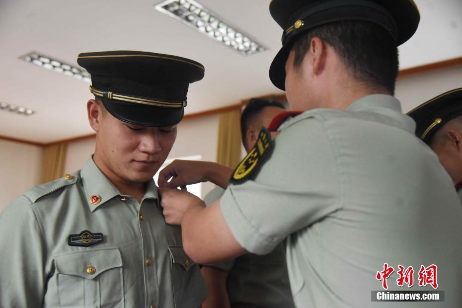 图为退役士兵卸下军衔、帽徽、领花。 高铭 摄