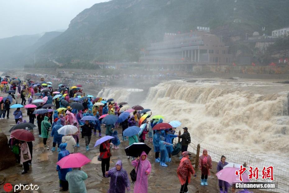 2019年10月6日,众多游客在山西吉县壶口瀑布景区冒雨观瀑。国庆假期,受降雨天气影响,山西吉县黄河壶口瀑布水量大增,气势磅礴。虽然下雨,但挡不住游客观瀑的热情,壶口瀑布景区游人如织。 图片来源:ICphoto