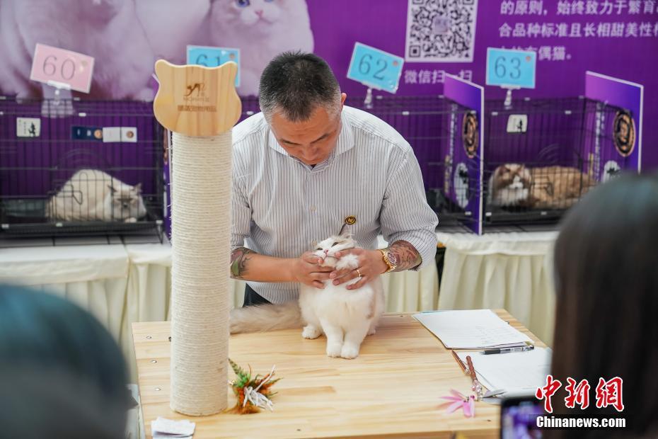 10月12日,广西南宁一商场举行纯种猫选美比赛,共有72只猫咪参赛。据悉,参加该比赛的猫咪需要提供3代以内直系亲属的血统证明方可报名参赛。图为评委为一只参赛猫评分。中新社记者 陈冠言 摄