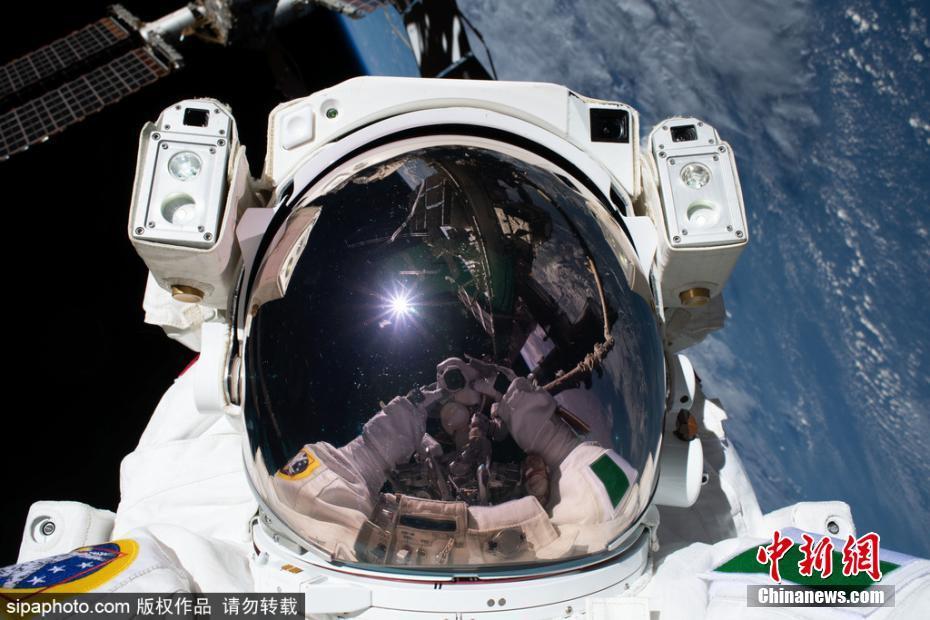 图为宇航员在太空留下“宇宙自拍照”。Sipaphoto版权作品 禁止转载